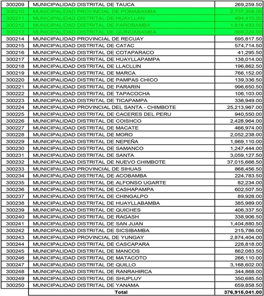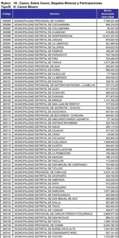Los Gobiernos Locales de la región Áncash han sido beneficiados con la asignación financiera correspondiente al adelanto del 50 % del Presupuesto Institucional de Apertura (PIA) 2026 por concepto de Canon Minero, conforme a lo establecido por el Gobierno Central.