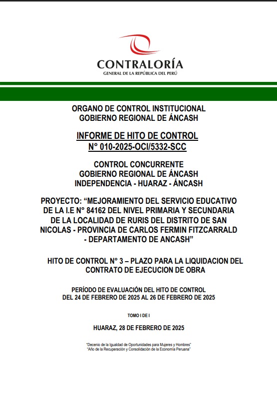 La Contraloría General de la República alertó demora en la reactivación de los trabajos de mejoramiento de la Institución Educativa N° 84162 de la localidad de Ruris, distrito de San Nicolás (Carlos Fermín Fitzcarrald), a causa del retraso en la liquidación del contrato de ejecución. La obra, a cargo del Gobierno Regional (Gore) de Áncash, permanece inconclusa y abandonada desde el 2023 en perjuicio de la población estudiantil y docente.