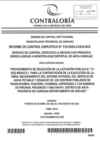 La Contraloría General de la República, evidenció que -en el 2022- funcionarios de la Municipalidad Distrital de Anta, provincia de Carhuaz, favorecieron a un postor con la adjudicación de la obra de mejoramiento del sistema integral de agua potable y alcantarillado para los centros poblados de Trancapampa, Huacrán, Chamana y Esperanza, así como para los barrios de Piñuran, Progreso y Machapay, valorizada en S/8 445 419. Esta situación se originó por irregularidades en el proceso de selección, lo cual impidió a la comuna obtener una mejor oferta.