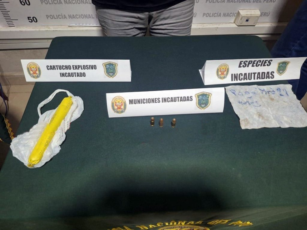 Al registrar su vehículo, una mototaxi azul de placa 70341F, los efectivos hallaron una bolsa de polietileno que contenía un cartucho de dinamita marca FAMESA, tres municiones sin percutir (dos calibre 9 mm marca Luger y una PNP 9×19 mm) y un papel con un mensaje amenazante que decía: “Paga mrda 24 horas”.