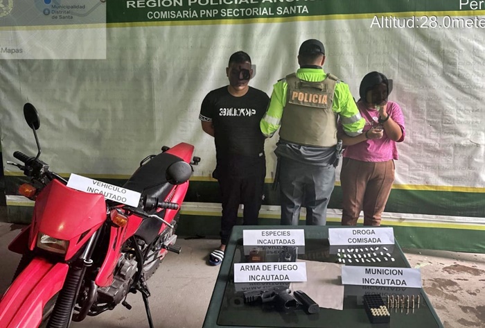 La Policía Nacional detuvo a Edduar Copillo Ponce (28) y Carmen Lázaro Dionicio (28) en posesión de una pistola abastecida, una caja de municiones y 30 ketes de pasta básica de cocaína (PBC). La intervención se llevó a cabo ayer en el sector La Huaca (primera etapa), en el distrito de Santa, región Áncash.