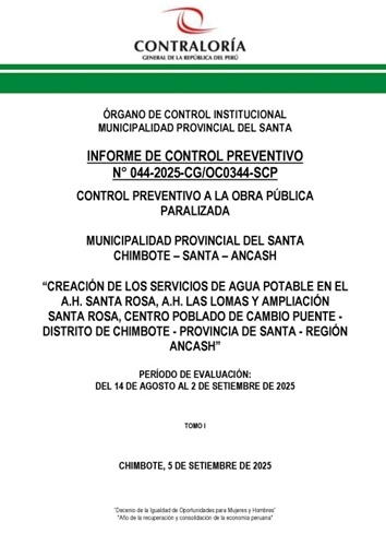 Las recomendaciones señaladas en el informe de control preventivo a la obra pública paralizada, que al reactivarse dotará de agua potable a tres sectores de Cambio Puente, fueron incluidas en el Acta de Compromisos n.° 001-2025-CG/OC0344, firmada el 28 de agosto de 2025, por los integrantes de la comisión de control y funcionarios y servidores de la MPS.