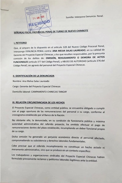 Una denuncia penal ha sido presentada contra la gerente general del Proyecto Especial Chinecas, Ana Melva Salas Laureano, por presuntas irregularidades en el pago de remuneraciones a trabajadores de dicha entidad, lo que habría generado preocupación e indignación entre el personal afectado.