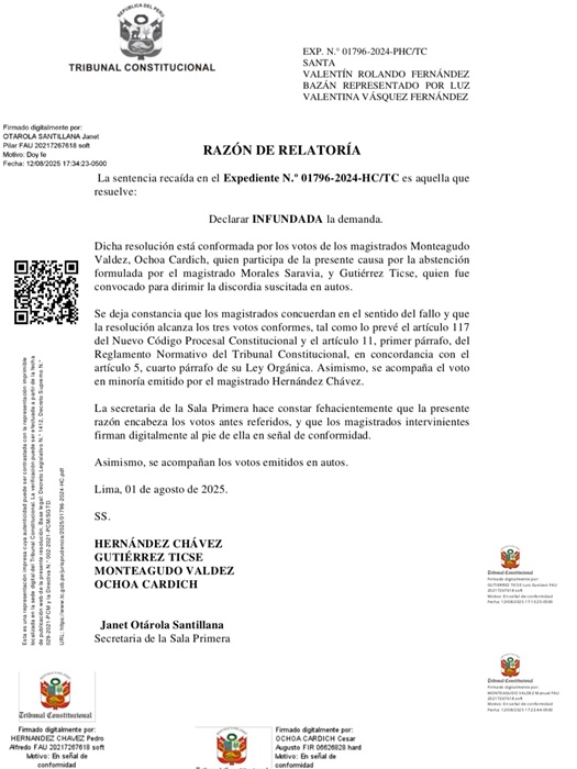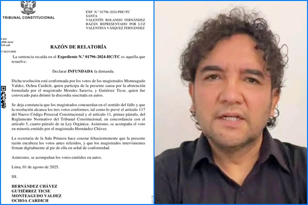 La sentencia 980/2025 recaída en el expediente N° 01796-2024-HC-TC declara infundada la demanda con los votos de los magistrados Manuel Monteagudo Valdes, Luis Gutierrez Ticse y César Ocho Cardich, quien reemplazó al cuestionado Francisco Morales Saravia acusado de pretender favorecer a Valentín Fernández por sus vínculos con Heriberto Benitez. En minoría votó a favor el magistrado Pedro Hernández Chávez.