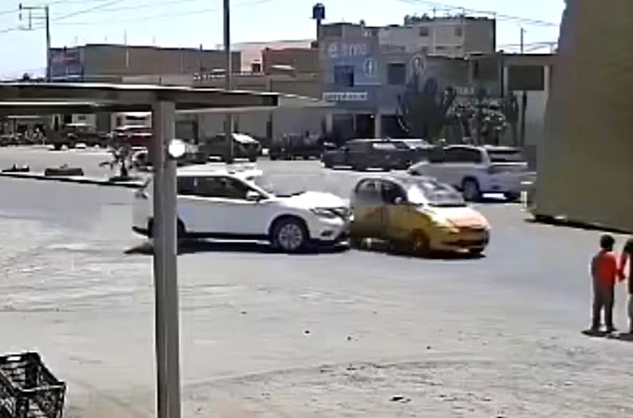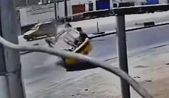 Las cámaras de seguridad mostraron que una camioneta blanca, con placa H2A-543, ingresó a la avenida sin respetar la preferencia de paso, colisionando de manera violenta con un taxi Tico amarillo que circulaba correctamente por su carril.