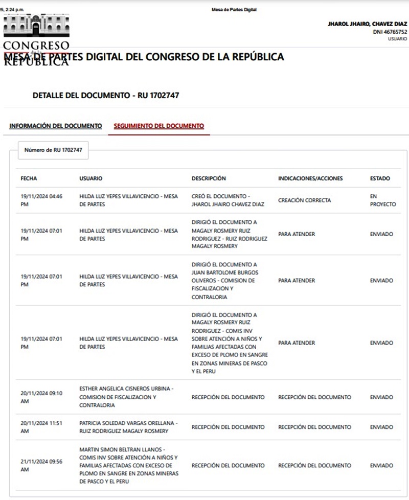 Cabe mencionar que el ciudadano huarmeyano, Jhairo Chávez Díaz, presentó un documento el pasado 21/11/24 a esta misma comisión del Congreso para que se interesen por la grave contaminación de menores y gestantes en Puerto Huarmey y 9 de Octubre. Han pasado 3 meses y dicha comisión presidida por la congresista de APP Magaly Ruiz Rodríguez, sesionarán en Huarmey para conocer los casos de grave contaminación del 80% de personas en toda la provincia.