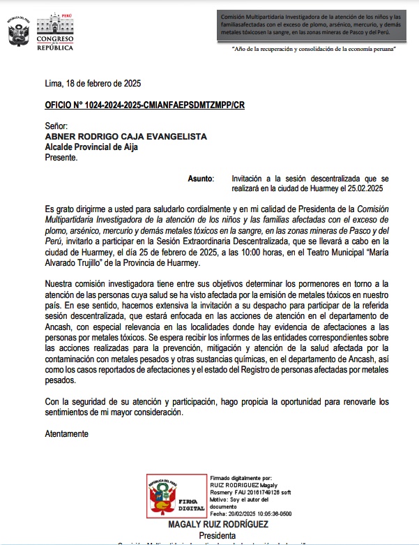 La Comisión multipartidaria investigadora de la atención de los niños y las familias afectadas con el exceso de plomo, arsénico, mercurio, y demás metales tóxicos en la sangre, en las zonas mineras de Pasco y del Perú, presidida por la congresista Magaly Ruiz Rodríguez (APP), convocó a una sesión descentralizada a los titulares de las diferentes instituciones públicas de la provincia y autoridades de la región Áncash, para que de una vez por todas se analice la contaminación que viene afectando la salud de la población ancashina.