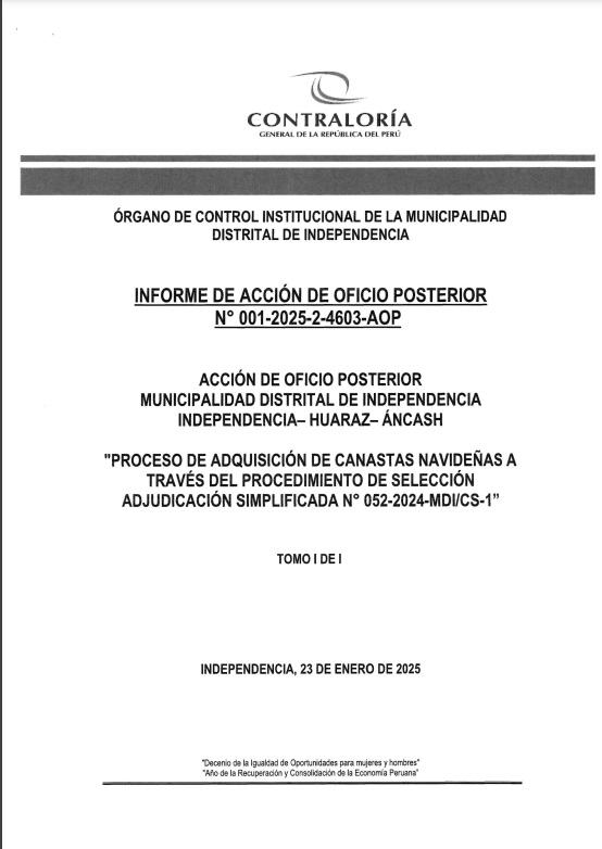 La Contraloría General detectó irregularidades en la adquisición y entrega de 397 canastas navideñas, que se realizó en diciembre del año pasado por un valor total superior a los S/ 119 000, a favor de trabajadores y funcionarios de la Municipalidad Distrital de Independencia. En dicha compra se utilizaron cotizaciones de proveedores que no se dedicaban a la venta de alimentos para fijar el precio referencial, y se consideraron como beneficiarios a personal que ya no laboraba en la institución.