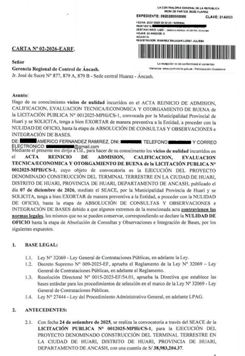 El ciudadano Américo Ramírez Fernández presentó una denuncia formal ante diversas instancias de control del Estado, alertando sobre presuntos actos de corrupción, colusión y direccionamiento en la Licitación Pública N.° 001-2025-MPHI/CS-1, convocada por la Municipalidad Provincial de Huari para la ejecución del citado proyecto.