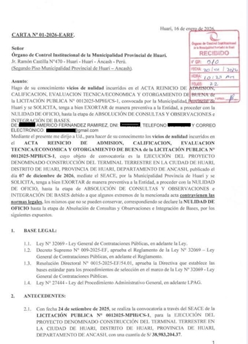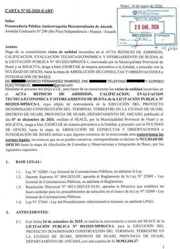 El proceso fue publicado en el SEACE el 7 de diciembre de 2025 y, según la denuncia, habría sido direccionado para favorecer al Consorcio Terminal Terrestre Huari, presuntamente con participación directa del alcalde provincial y determinados funcionarios municipales.