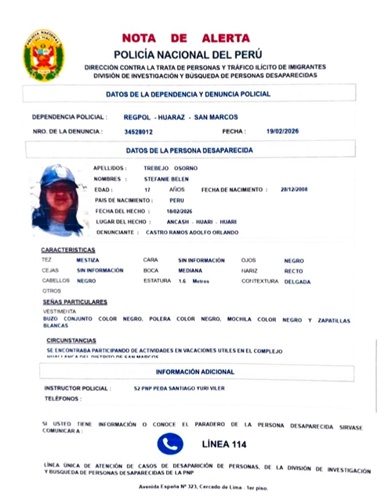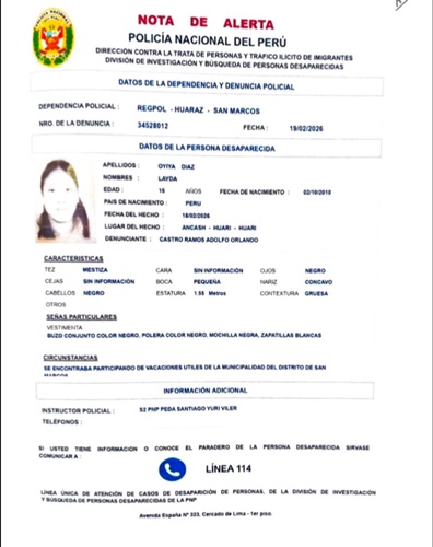 Dos adolescentes se encuentran desaparecidas desde el pasado 18 de febrero de 2026, luego de participar en actividades recreativas organizadas por la Municipalidad Distrital de San Marcos, en la provincia de Huari, región Áncash.
