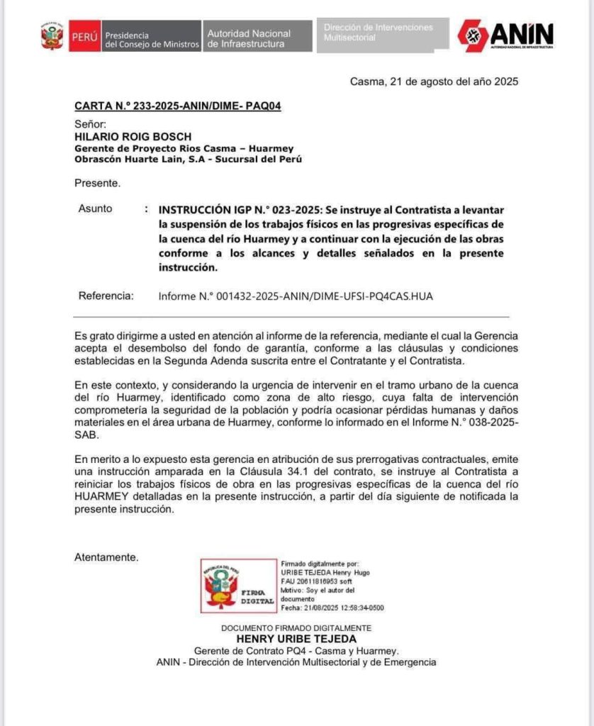 La Autoridad Nacional de Infraestructura (ANIN), a través de la Dirección de Intervenciones Multisectorial y de Emergencia, dispuso levantar la suspensión de los trabajos físicos en la cuenca del río Huarmey y ordenó al gestora de la obra Obrascón Huarte Lain S.A. (OHLA) reiniciar de inmediato la movilización de personal y equipos para continuar con la obra de defensa ribereña en el río Huarmey.