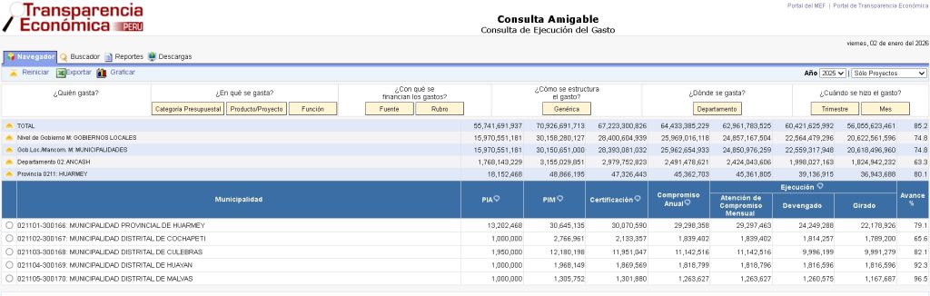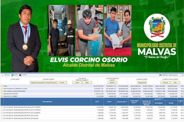 Teniendo en cuenta los datos del portal de Transparencia Económica del Ministerio de Economía y Finanzas (MEF) al cierre del año fiscal 2025, la Municipalidad Distrital de Malvas, se posicionó como líder en la provincia de Huarmey al alcanzar un destacado 96.5% de ejecución presupuestal el 2025.