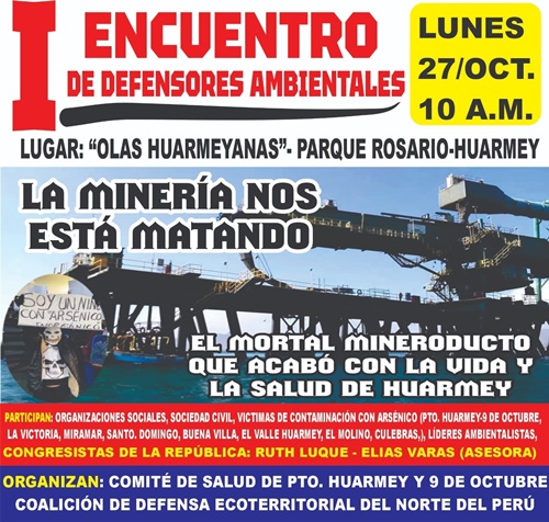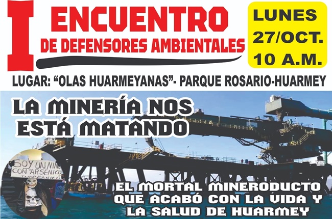 El Comité de Salud de Puerto Huarmey y 9 de Octubre, realizarán un taller y conversatorio sobre “La minería nos está matando” y el impacto del mineroducto en la población de Huarmey; el evento contará con la presencia de los congresistas Ruth Luque y de la asesora del congresista Elías Varas. El encuentro se realizará este lunes 27 de octubre a las 10:00 de la mañana en el local «Las Olas Huarmeyanas» del Parque El Rosario.