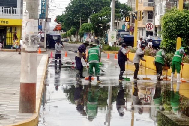 Ante la intensa lluvia registrada esta madrugada de hoy sábado en la ciudad, el personal de la municipalidad provincial de Huarmey, realizaron labores de limpieza de calles que quedaron anegadas, con el objetivo de restablecer el tránsito vehicular y peatonal.
