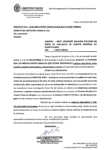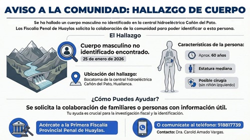 El Ministerio Público informó sobre el hallazgo del cuerpo sin vida de una persona de sexo masculino no identificada, ocurrido el 25 de enero de 2026 en la bocatoma de la Central Hidroeléctrica Cañón del Pato, ubicada en el distrito de Huallanca, provincia de Huaylas.