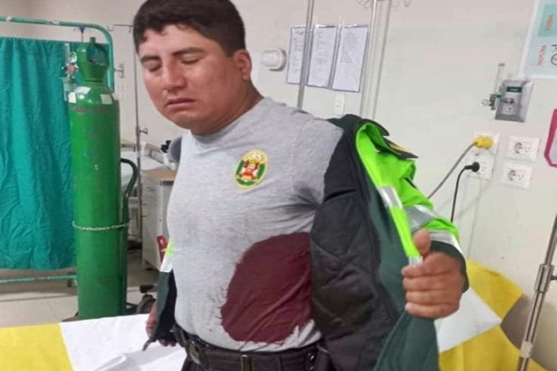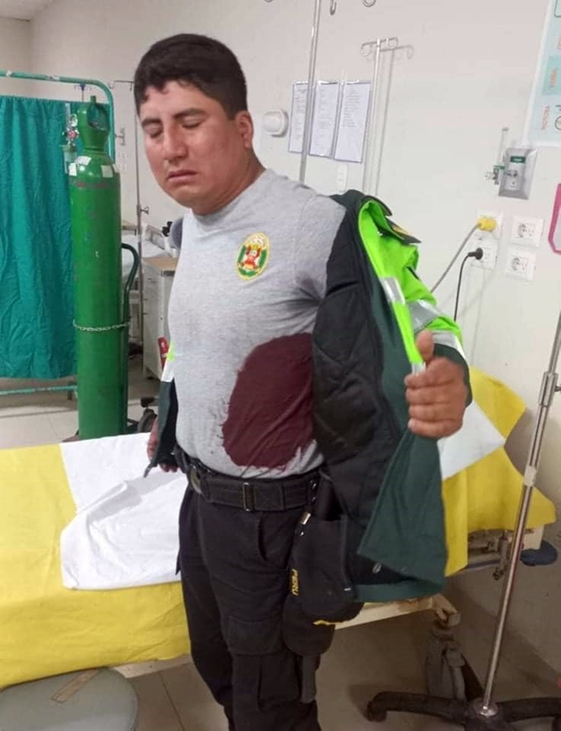 El policía fue trasladado de urgencia al hospital local, donde recibe atención médica por la gravedad de la herida. Las autoridades continúan con las investigaciones del caso.