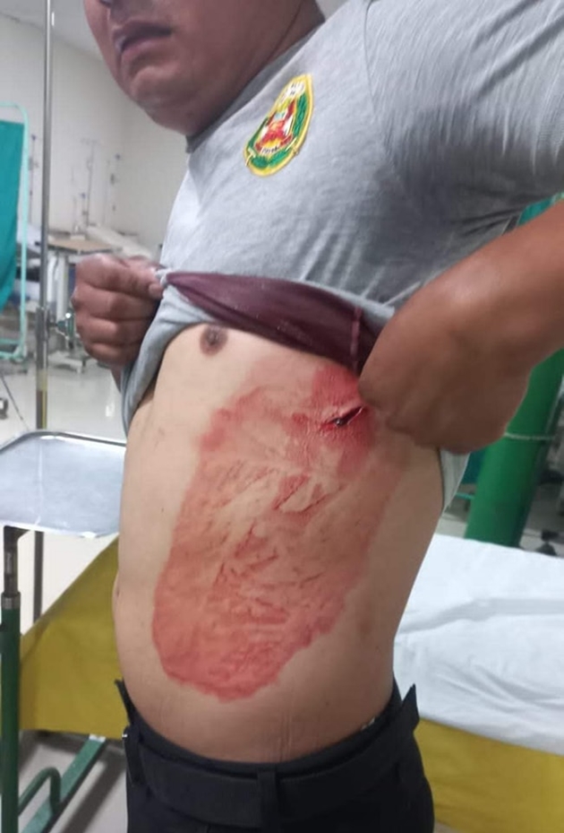 Los efectivos de la Policía Nacional frente al llamado de los familiares, desesperados por que se estaba generando una violencia familiar, acudieron al auxilio pero sin embargo uno de los efectivos identificado como el SO2 de apellido Botello, lastimosamente fue atacado con un cuchillo en la parte lateral del tórax, por el agresor que venía cometiendo el delito de violencia familiar.