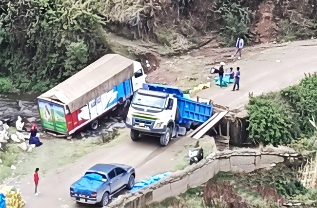 De acuerdo a lo señalado por los testigos, en esta jurisdicción del distrito, circulan gran cantidad de volquetes transportando mineral que recogen de las minas asentadas en esta zona, esta vez el puente artesanal de troncos de eucalipto no soportó el peso y cedió, quedando el volquete con las llantas posteriores hundidas.