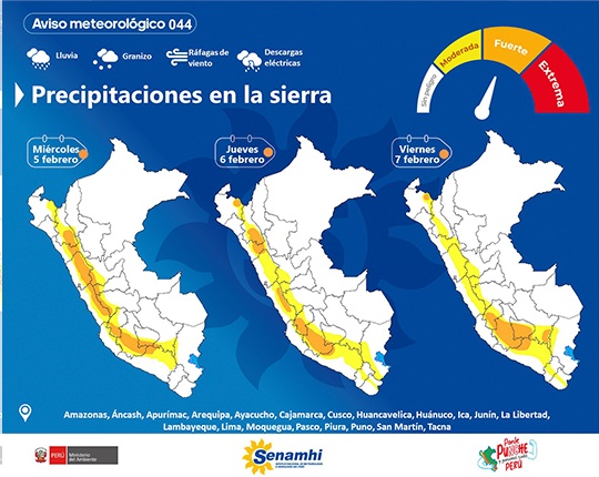 El Servicio Nacional de Meteorología e Hidrología (Senamhi) anunció la continuidad de las precipitaciones (nieve, granizo, aguanieve y lluvia), de moderada a fuerte intensidad, en la sierra de Áncash, del miércoles 5 al viernes 7 de febrero.