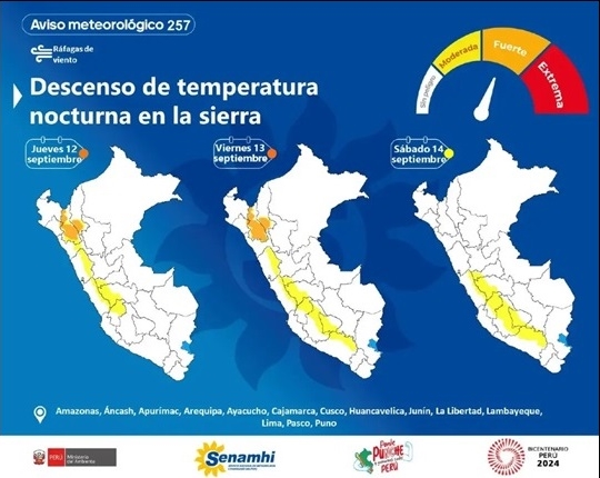 El Servicio Nacional de Meteorología e Hidrología del Perú (Senamhi) advirtió sobre un descenso de la temperatura nocturna, de moderada a fuerte intensidad, en la sierra de la región Áncash y otras regiones del país.