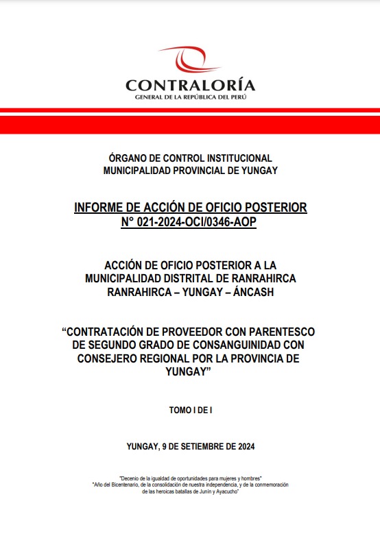 Mediante dos informes de control posterior, la Contraloría General detectó que un familiar de un consejero regional por la provincia de Yungay prestó servicios como asesor legal externo en las municipalidades distritales de Ranrahirca y Yanama, en la jurisdicción de dicha provincia, a pesar de que estaba impedido de contratar con el Estado.